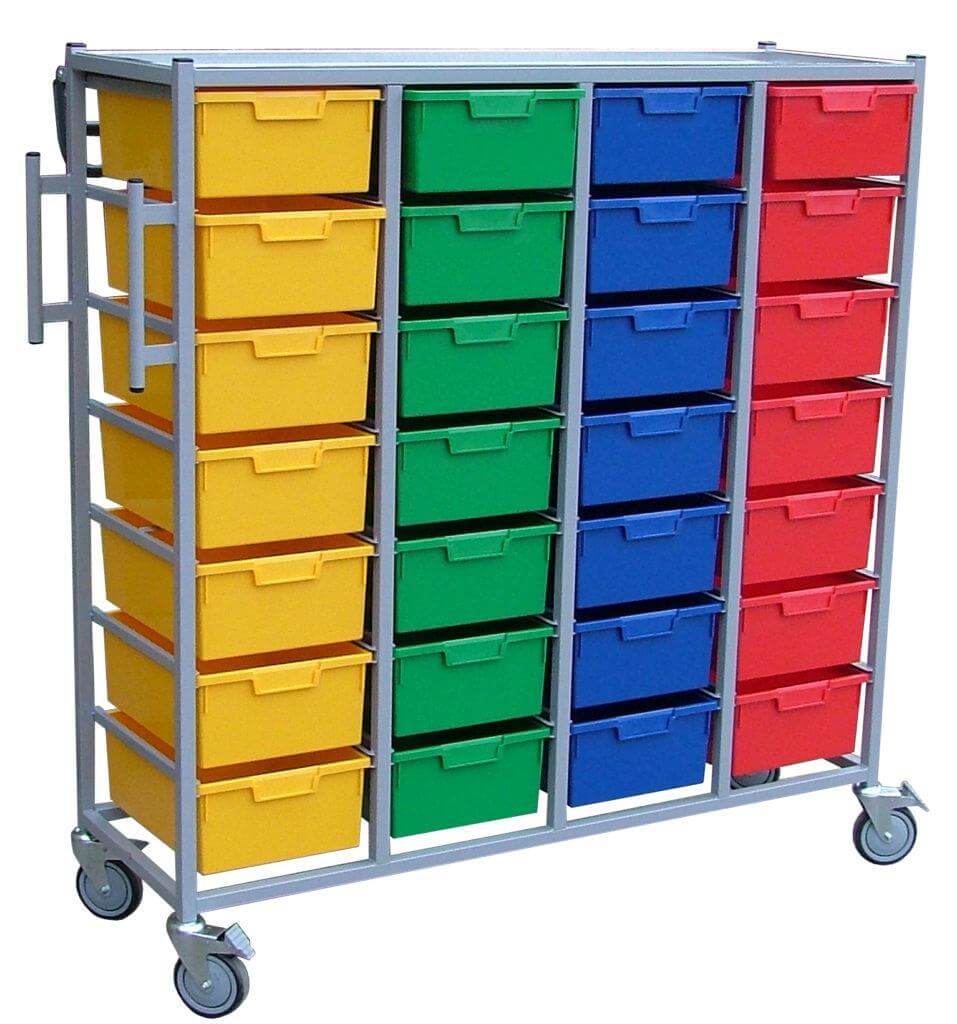 These Karri-Carts are designed as sturdy stacking units for the distribution of clean personal clothing. The Karri-Carts are made from a high quality MRSA resistant powder coated steel. They are lightweight and come complete with a selection of coloured trays for ease of sorting as well as a robust hanging rail to transport products on hangers. Quad – 28 trays with garment rail 166 x 139.5 x 54 cm